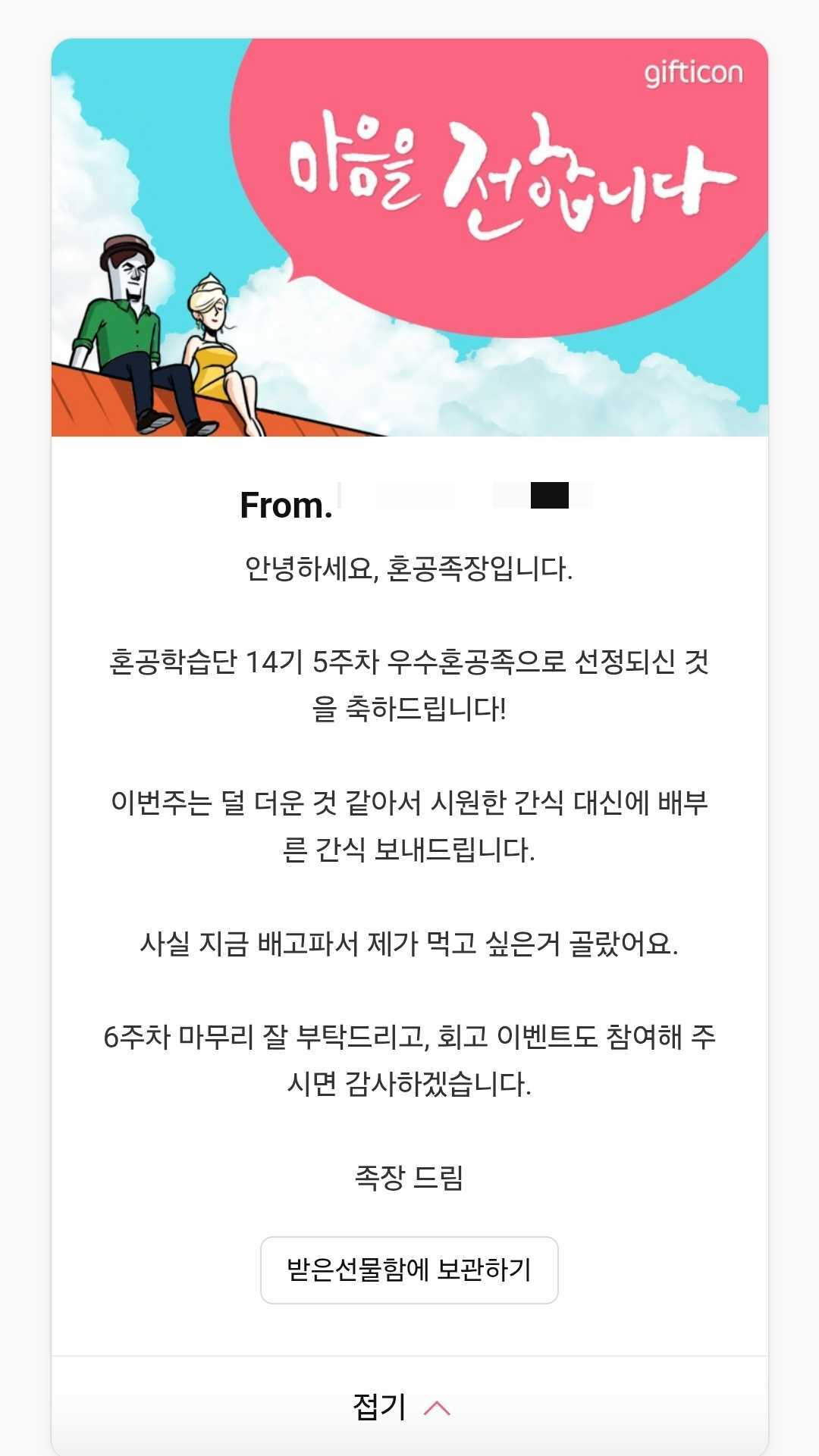 열심히 하다보니 5주차에는 우수 혼공족으로 선정되었는데, 혼공학습단 덕분에 맛있는 간식을 더 먹을 수 있었다.